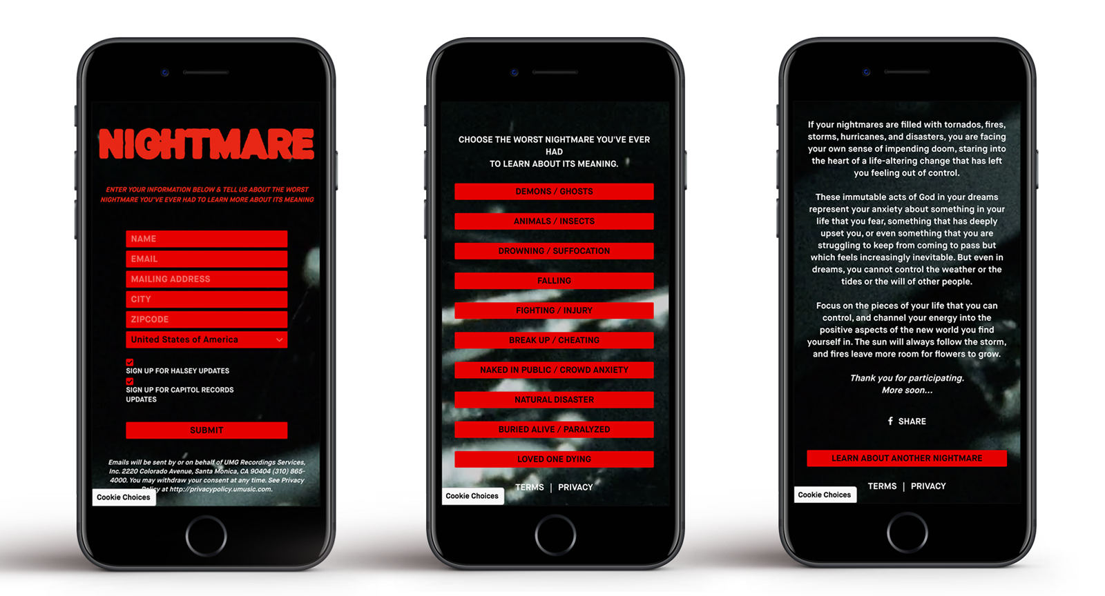 In tandem with her release of the track ‘Nightmare,’ Halsey wanted to release an interactive experience for her fans, while also starting to build excitement around her upcoming album. Following the nightmare schema, she wanted the experience to allow fans to explore the meanings behind their nightmares. And, while she wanted the design to be dark and mysterious in aesthetic, she wanted the user flow to be as simple and straightforward as possible to encourage fans to dive into multiple nightmares and share it across their social media accounts. So, nightma.re was born.